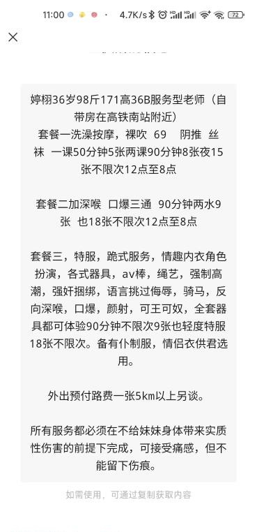 年纪问起来说是37,但是感觉应该40出头了,胸小,可以玩三通和轻度SM,玩SM的话是9张90分钟或者1800包夜, ...